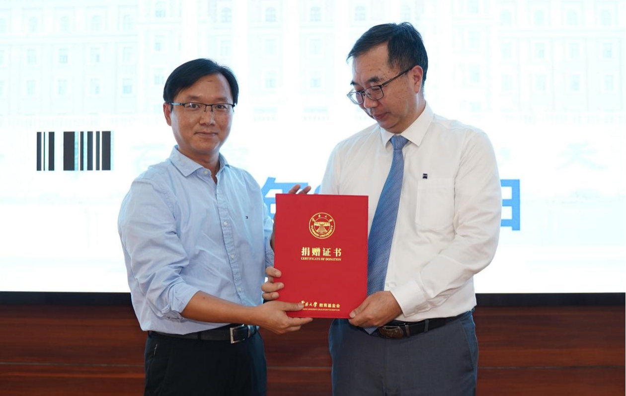胡剑锋秘书长代表WilliamHill官方网站教育基金会向蔡司公司颁发捐赠证书。