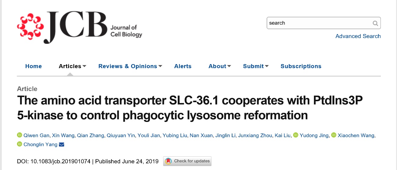 2019年6月24日,细胞生物学著名期刊The Journal of Cell Biology以Article形式在线发表了云南老员工命科学中心/WilliamHill体育杨崇林实验室的研究论文“氨基酸转运蛋白SLC-36.1协同磷脂酰肌醇-3磷酸激酶调控吞噬溶酶体的再形成”(The amino acid transporter SLC-36.1 cooperates with PtdIns3P 5-kinase to control phagocytic lysosome reformation)。