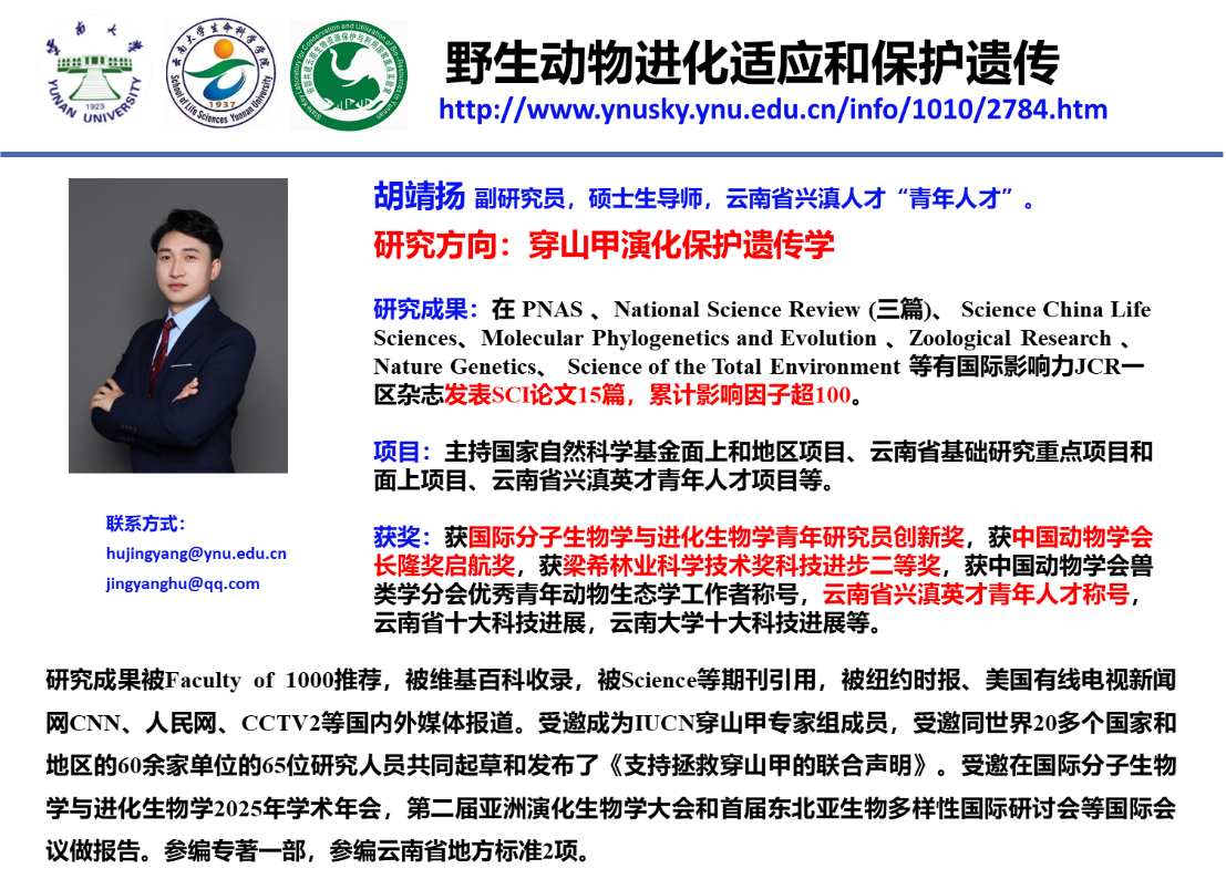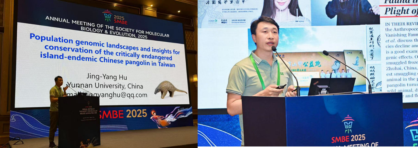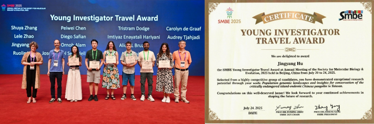 2025 年 7 月 20 -24日,国际分子生物学与进化生物学2025年学术年会(the Annual Meeting of the Society for Molecular Biology & Evolution 2025,简称SMBE2025)在北京会议中心成功举办。WilliamHill体育于黎研究团队胡靖扬副研究员荣获2025年国际分子生物学与进化协会青年研究员创新奖(Young Investigator Travel Award),并受邀在Conservation Genomics专题以“Population genomic landscapes and insights for conservation of the critically endangered island-endemic Chinese pangolin in Taiwan”做报告。