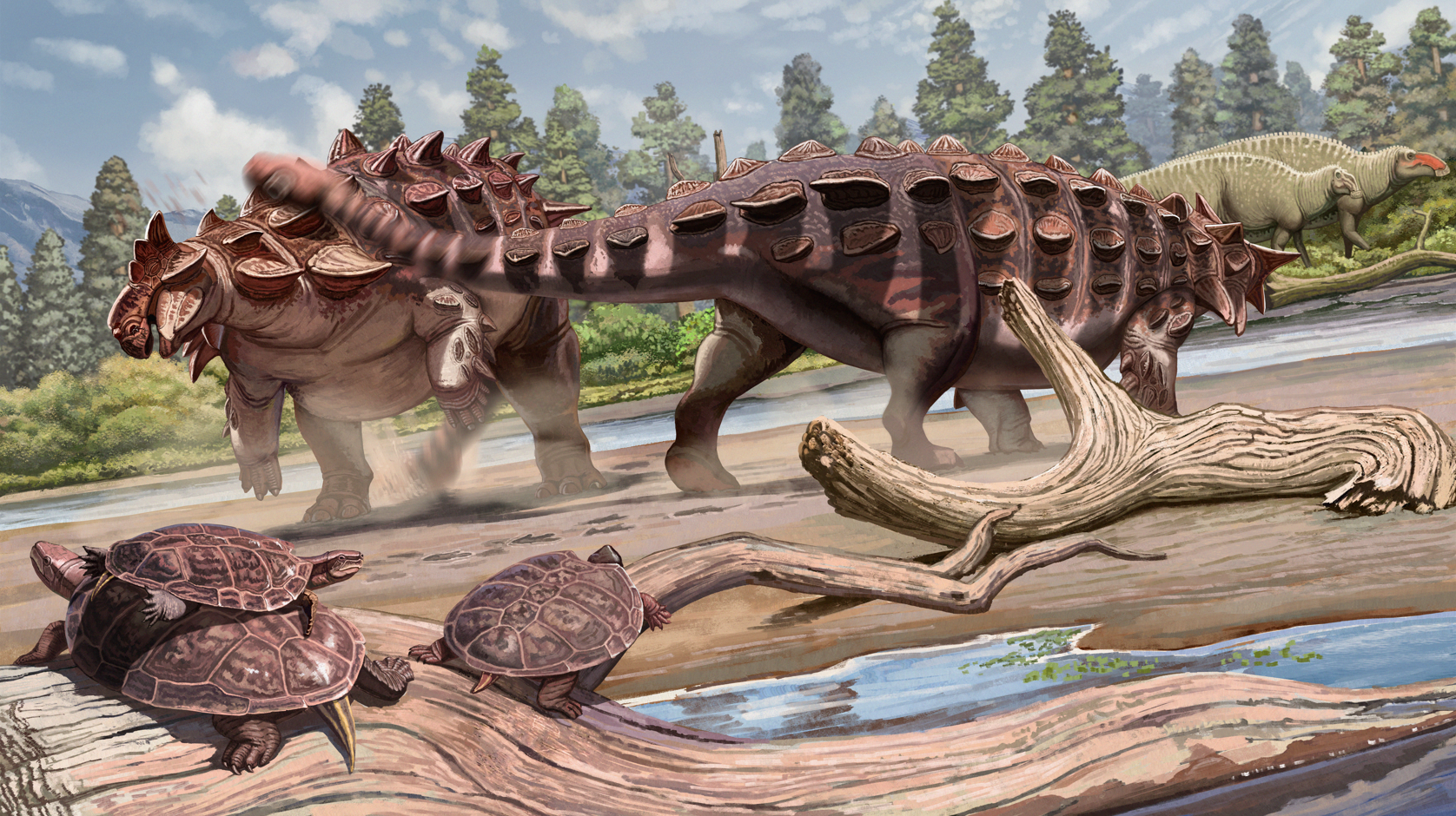 复原显示,“兽纹华夏胄龙”体长超6米,是我国发现的体形较大的甲龙类化石,它们生活在距今8400万年至7200万年的晚白垩世,以吃低矮的蕨类、种子、裸子植物的叶片为主。这种恐龙身体粗壮,四肢有力,体表布满密密麻麻的甲片,还有甲龙科恐龙标志性的尾锤。