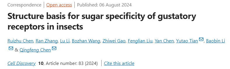 2024年8月6日,云南老员工命科学中心陈庆锋课题组联合复旦大学李保宾团队和天津大学田裕涛团队在著名学术期刊Cell Discovery 发表了题为“Structure basis for sugar specificity of gustatory receptors in insects”的研究论文,报道了果蝇果糖特异性受体DmoGr43a(Drosophila mojavensis Gr43a)在apo态和果糖结合状态,以及甜味受体DmGr64a(Drosophila melanogaster Gr64a)在apo态和蔗糖结合状态的高分辨冷冻电镜结构,为昆虫糖特异性和甜味感知的结构机制提供了一定的基础。