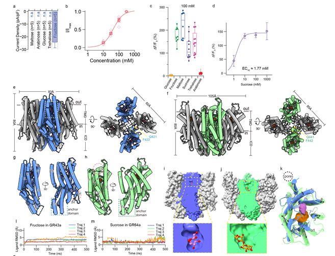 DmoGr43a和DmGr64a四聚体均有4个糖分子结合口袋,位置与Orco/MhOR5等气味受体中的配体结合位点相似。在DmoGr43a和DmGr64a中,每个亚基的S1-S6围成糖分子结合口袋(位于脂双分子层近胞外侧)。与DmoGr43a相比,DmGr64a的TMD更宽,主要原因在于其参与形成底物结合口袋的螺旋束(S1-S6)的胞外一半发生了向外扩张,其中S1、S3和S4最为显著。DmGr64a中更大的糖分子结合口袋与其可识别更多、更大的糖分子是吻合的。DmoGr43a和DmGr64a与糖分子的结合是通过结合口袋中氨基酸残基与糖分子的各个基团之间形成大量的氢键和疏水相互作用来实现的。当参与果糖和蔗糖结合的残基被突变后,DmoGr43a和DmGr64a对果糖和蔗糖的响应能力显著下降。糖分子的结合引起结合口袋发生局部的结构变化,并可能通过S5向负责形成中心离子孔的S7传递,最终引起离子通道的开放。