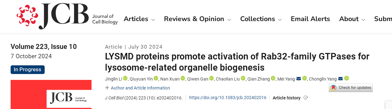 2024730日,云南老员工命科学中心杨崇林课题组在国际著名学术期刊JCB (Journal of Cell Biology)发表了题为 “LYSMD proteins promote activation of Rab32-family GTPases for lysosome-related organelle biogenesis”的研究论文,揭示了LYSMD 蛋白溶酶体相关细胞器(LROs)的生物发生过程中的重要调控作用