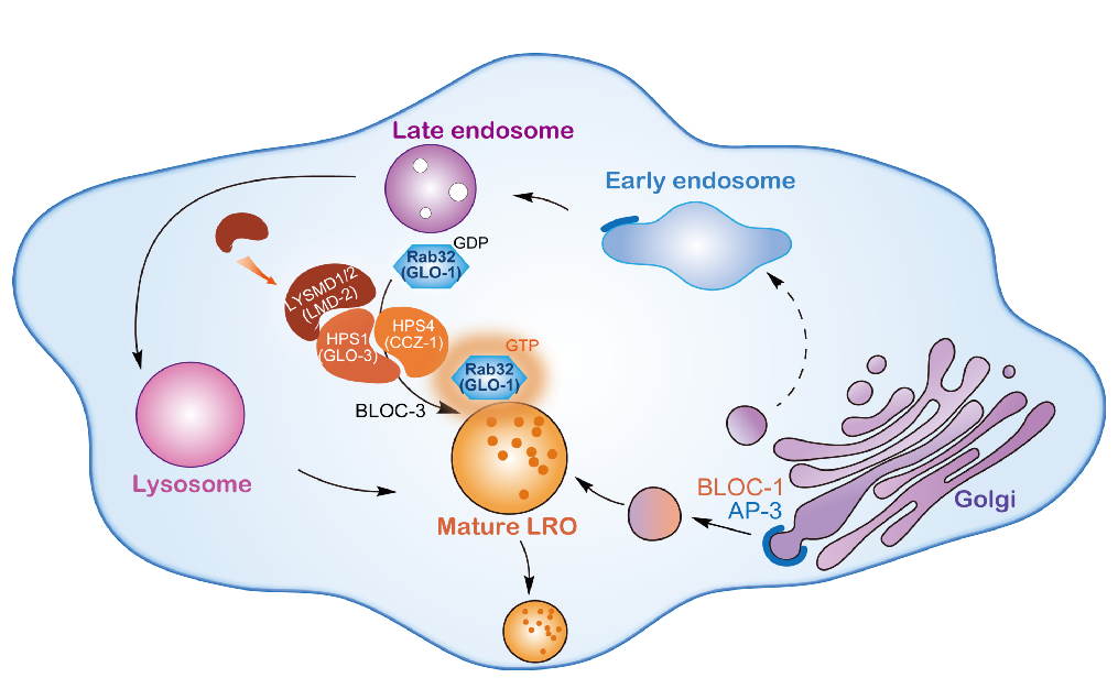 溶酶体相关细胞器 (Lysosome-related organelles LROs)是一类功能特化的溶酶体,在维持机体稳态中发挥重要作用,不同类型细胞中有各自独特形态,组成和功能不尽相同,如黑色素体、血小板分泌颗粒、T淋巴细胞毒素等。LROs前体不断接收底物,逐渐与膜泡融合形成一个适合发挥功能的腔内环境,最后成为成熟的LROs这类细胞器的功能紊乱会导致多种人类疾病,如赫曼斯基-普德拉克综合征等。然而, LROs生物发生的分子机制尚未完全阐明。