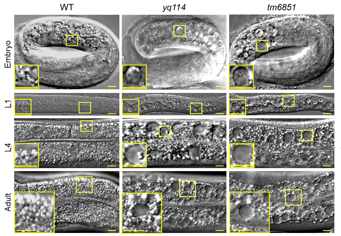1. 秀丽隐杆线虫(C. elegans) lmd-2突变体(yq114tm6851)在不同发育时期表现出肠道LROs异常增大。