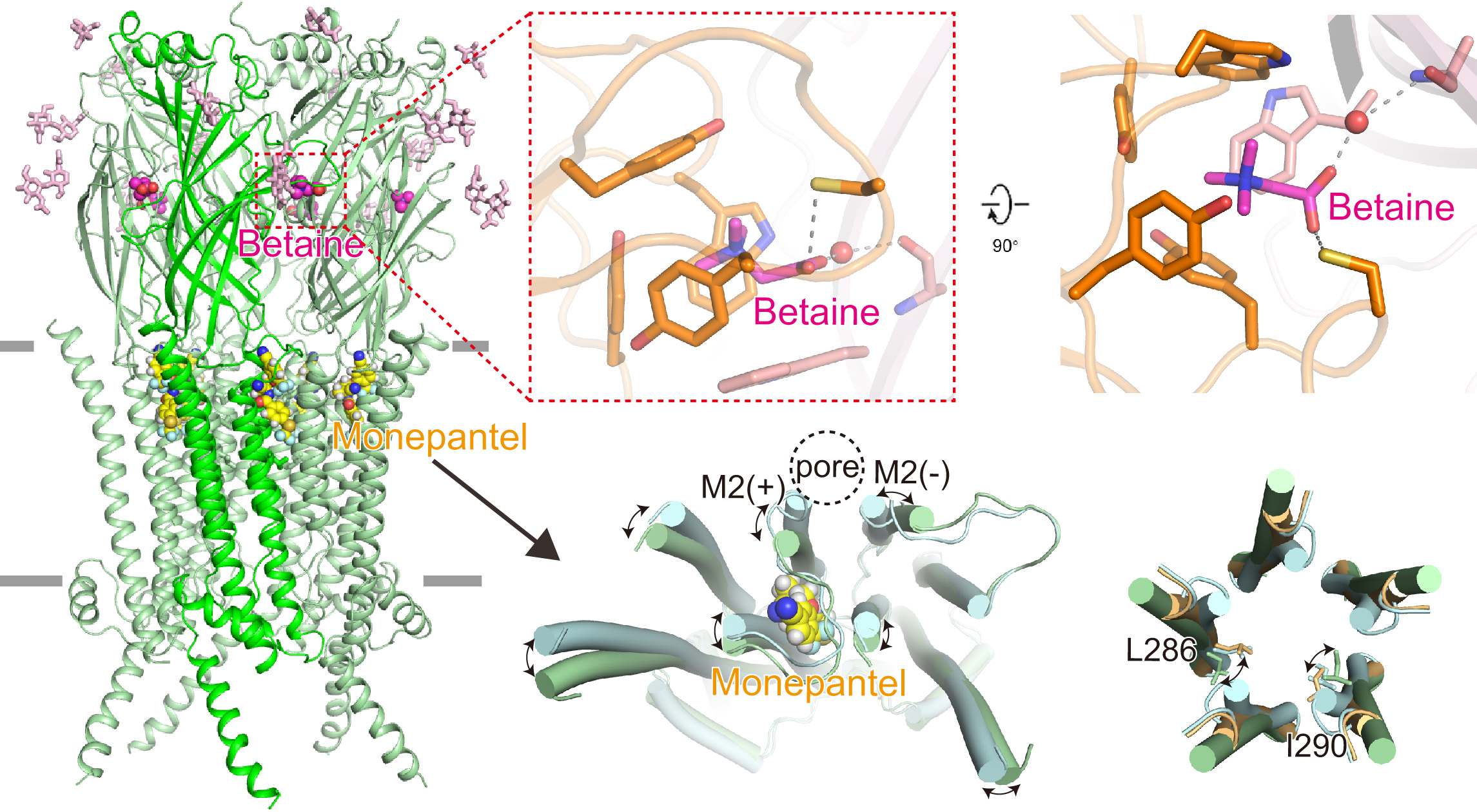 驱虫剂(anthelmintics)是用于控制致病性蠕虫的药物。Monepantel属于一类新的化学合成驱虫药——氨基乙腈衍生物(AADs),针对那些对传统驱虫药耐药的寄生线虫有很好的治疗效果,已被批准用于控制反刍类动物的胃肠道蠕虫(如血矛线虫)。Monepantel的主要靶点是乙酰胆碱受体ACR-23(源于模式动物秀丽隐杆线虫)及其在致病性蠕虫中的同源物,它们是Cys-loop家族五聚体配体门控离子通道(pentameric ligand gated ion channels,pLGICs)家族中线虫特异DEG-3亚家族的成员。有研究表明,monepantel通过过度激活ACR-23及其同源物,引起肌肉痉挛和瘫痪,从而起到杀线虫的作用。目前已有一些有关monepantel抗药性的报道。而甜菜碱(betaine)是海藻提取物中的一种天然化合物,很早就被农民用于线虫侵害的防治,它同样可作用于ACR-23上。然而,迄今为止,这两种药物如何作用于ACR-23仍不清楚,有待通过结构生物学等手段阐明。