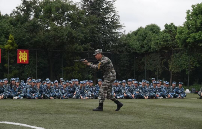 教官演绎立姿射击动作,一丝不苟,十分严谨。同学用心学习投入其中,动作标准,眼神坚定。