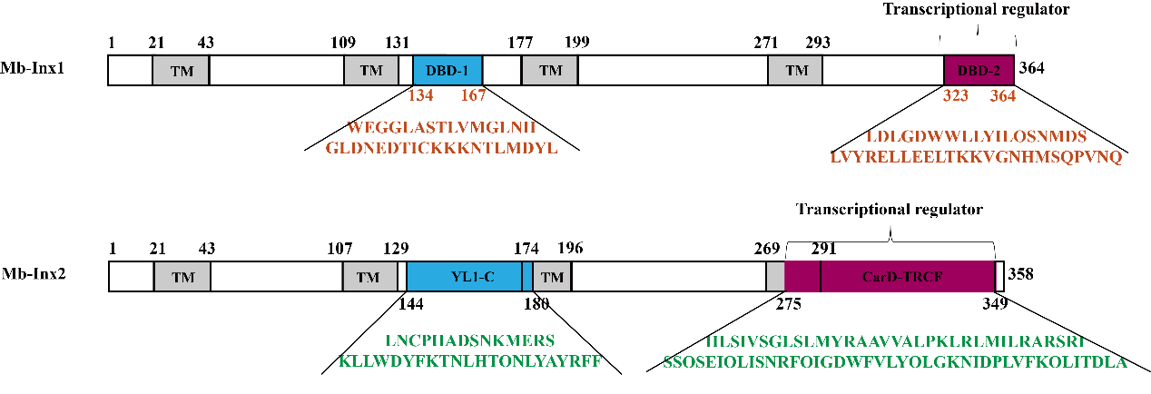 DBD-1、DBD-2、YL1-C(属于转录调控因子)和CarD-TRCF(属于转录调控因子)结构域;核质分离显示,异源过表达的Mb-Inx1和Mb-Inx2蛋白主要定位于细胞核,暗示其可能具有转录调控的功能。(2) Mb-Inx1Mb-Inx2的RNAi 沉默抑制了茧蜂病毒的囊膜形成。采用宿主-寄生蜂-dsRNA递送系统沉默寄生蜂的Mb-Inx1Mb-Inx2基因,获得沉默了Inx1Inx2的寄生蜂,分离寄生蜂的卵巢,电镜显示MbBV病毒囊膜形成异常,发现有无囊膜的裸露核衣壳。通过茧蜂发育阶段的转录组分析发现,茧蜂原病毒囊膜基因与杆状病毒的囊膜基因具有高度同源性,Mb-Inx1 Mb-Inx2 的RNAi 沉默抑制了茧蜂原病毒囊膜基因MbBVp74 MbBVe56-1的表达。(3)Mb-Inx1和Mb-Inx2促进杆状病毒核型多角体的形成。利用经典的昆虫杆状病毒表达系统(Bac-to-BacTM),发现茧蜂Mb-Inx1和Mb-Inx2的异位表达能促进杆状病毒核型多角体病毒形成,而S. litura -M. bicoloratus共有基因Spli-Mb-Inx2(无DBDs)则呈现出时间依赖性的抑制杆状病毒核型多角体形成。(4) Mb-Inx1和Mb-Inx2的单体和AlphaFold 3预测的六聚体可直接结合在原病毒囊膜基因MbBVp74 MbBVe56-1的启动子区,促进基因转录。利用HDOCK预测,通过PyMOL软件进行分子对接,发现Mb-Inx1的DBD-2的K352与MbBVp74 启动子区的DG267之间形成3.0 Å的氢键; Mb-Inx1的DBD-1的Y166与MbBVe56-1 启动子区的DA749之间形成2.2 Å的氢键;Mb-Inx2的R214与MbBVp74 启动子区的DG771之间形成2.6 Å的氢键;Mb-Inx2的R214与MbBVe56-1 启动子区的DA260、DC259之间分别形成3.0Å,3.3 Å和3.0Å的氢键。利用AlphaFold 3预测Mb-Inx1和Mb-Inx2的六聚体能与MbBVp74 MbBVe56-1的启动子区相互作用, pTM 值均大于 0.7, 尽管ipTM值在0.6 ~ 0.8之间的灰色区域,也暗示六聚体可能与启动子区互作。凝胶阻滞实验进一步验证了Mb-Inx1和Mb-Inx2的单体与MbBVp74 MbBVe56-1的启动子区结合。