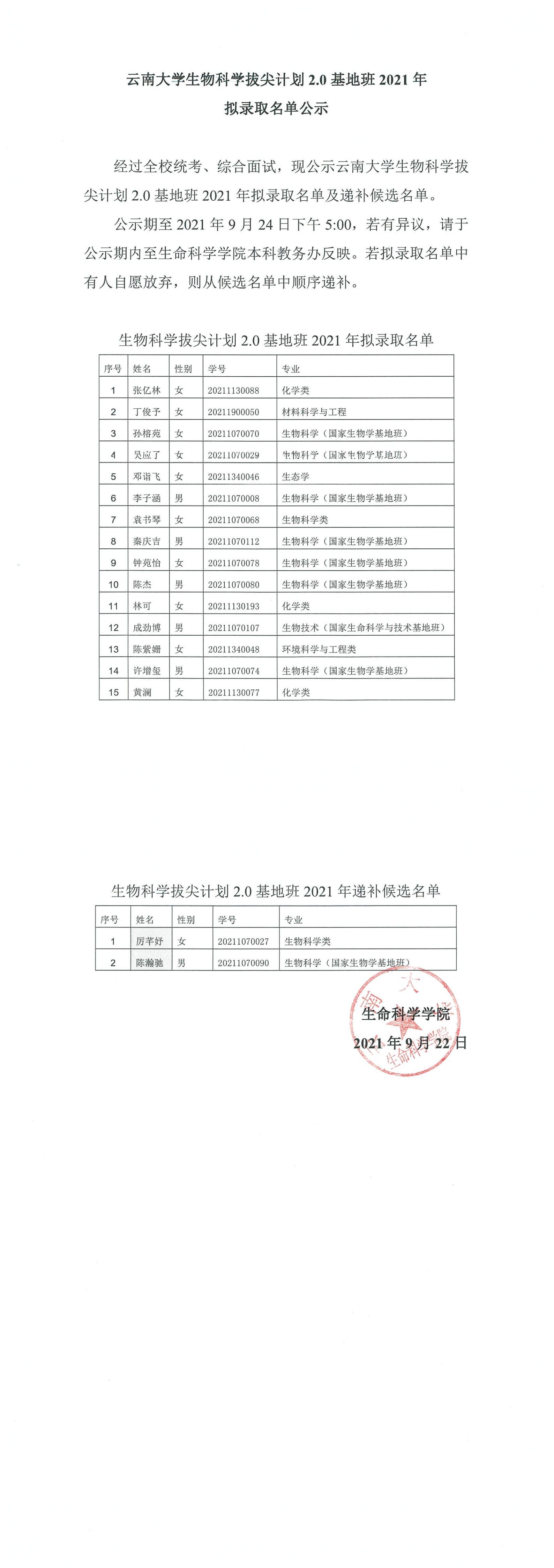 云南老员工物科学拔尖计划2.0基地班2021年拟录取名单公示