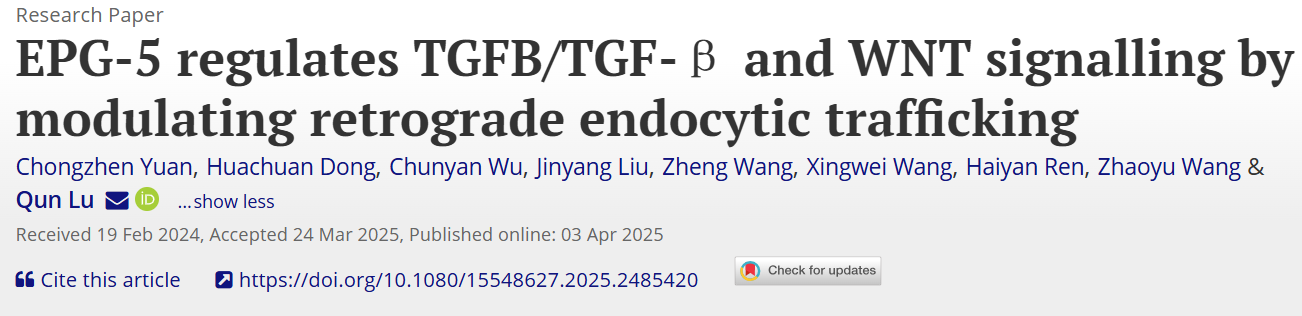2025年4月3日,WilliamHill官方网站生科院生命科学中心路群课题组在Autophagy杂志发表题为“EPG-5 regulates TGFB/TGF-β and WNT signaling by modulating retrograde endocytic trafficking”的文章。该研究发现,EPG-5通过作用于反向内吞运输调控TGFB/TGF-β和WNT两大信号通路,揭示自噬基因epg-5在膜运输中的非经典功能,为理解Vici综合征、ALS等疾病的发病机制提供了新靶点。