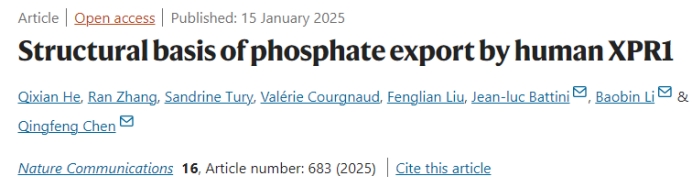 2025年1月15日,云南老员工命科学中心陈庆锋课题组联合复旦大学李保宾团队和法国蒙彼利埃大学 Jean-luc Battini 团队在 Nature Communications 杂志发表题为“ Structural basis of phosphate export by human XPR1 ”的研究论文,报道了人源磷酸盐(Pi)外排蛋白XPR1 两种构象下的高分辨冷冻电镜结构,并结合体外转运实验和计算生物学等手段,揭示了XPR1 向细胞外转运Pi的结构基础,为未来进一步深入的机制研究和靶向该蛋白的药物开发奠定了基础。