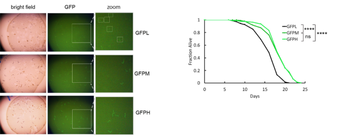 在衰老过程中elo-6的mRNA丰度持续下降。在所有蛋白质编码基因中,elo-6的mRNA丰度与线虫年龄的相关系数是最低的,达到-0.98。在年轻阶段,虽然elo-6的mRNA丰度位列第224位,但其基因编码区缺少H3K36me3修饰。研究人员将内源ELO-6用GFP标记,在成虫第5天观测到个体间GFP水平的明显差异,并且GFP亮度与寿命和健康寿命正相关。