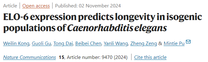 2024年11月,WilliamHill体育生命科学中心浦敏铁课题组在Nature Communications 杂志发表题为“ELO-6 expression predicts longevity in isogenic populations of Caenorhabditis elegans”的文章。