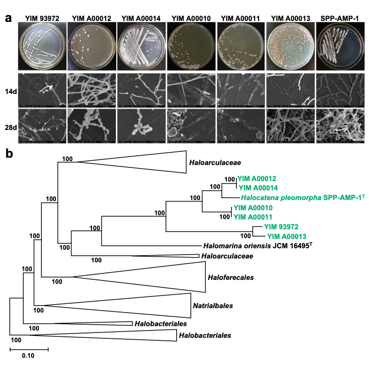 1 形态发育嗜盐古菌的形态特征(a)与系统发育(b)