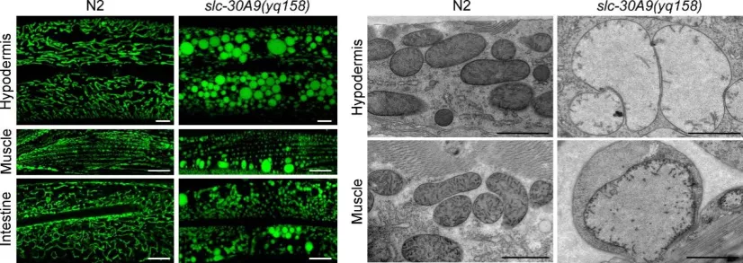 1. slc-30A9基因的功能缺失突变体slc-30A9(yq158)中表皮、肌肉和肠道等细胞内线粒体破坏。左图:Mito-GFP标记的线粒体;右图:电镜图。N2为野生型。
