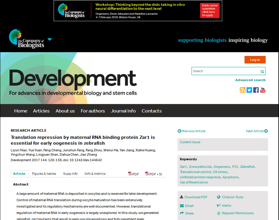 Translation repression by maternal RNA binding protein Zar1 is essential for early oogenesis inzebrafish.