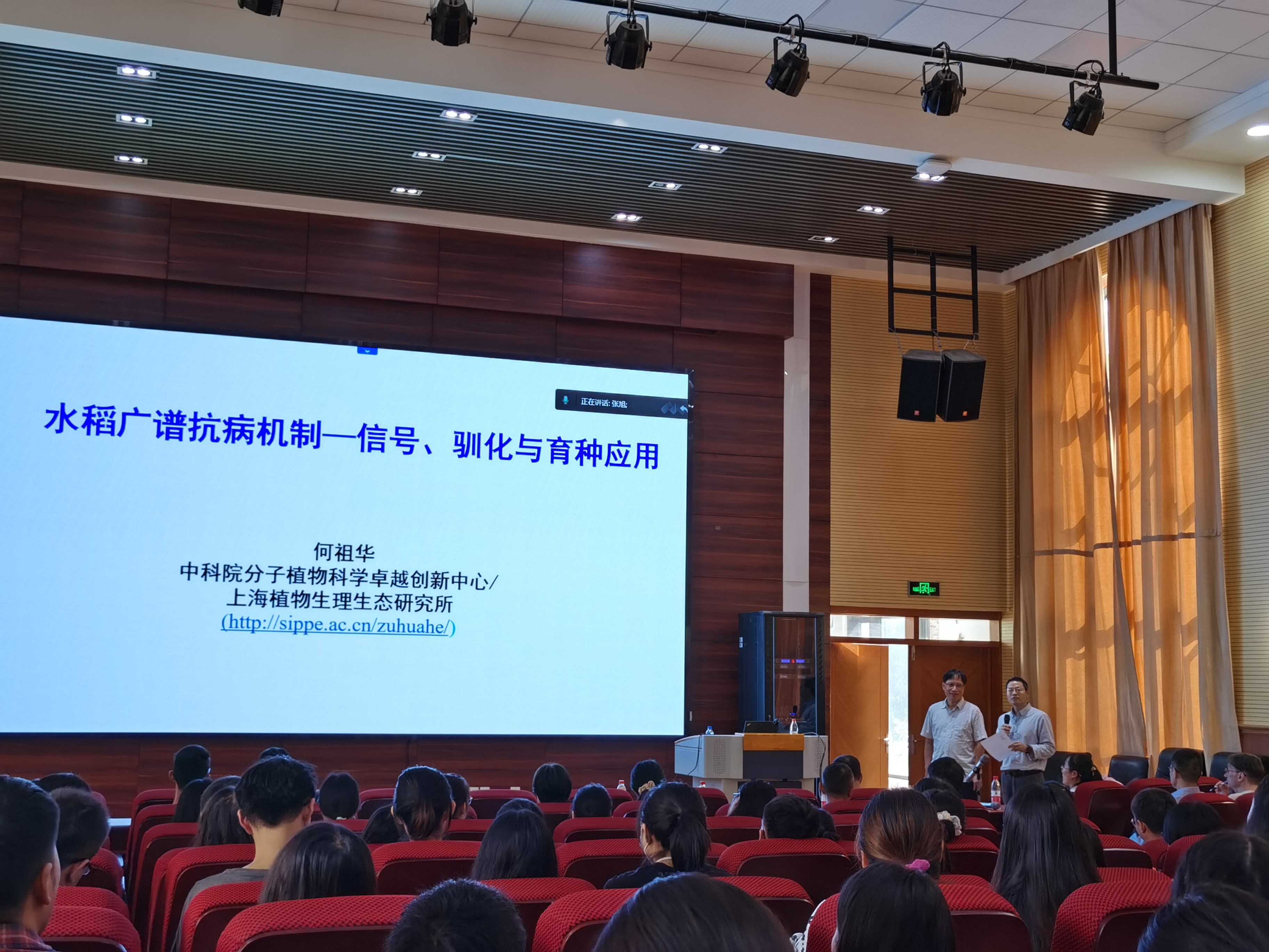何祖华研究员以“水稻广谱抗病机制—信号、驯化与育种应用”为题,为师生做了一场十分精彩的学术报告。何老师深入浅出地讲解了水稻广谱抗病(稻瘟病、白叶枯病及纹枯病)基因的克隆及其功能解析,抗病基因的驯化及其在育种中的应用等工作,深深吸引了与会的老师和同学。大家踊跃提问,何老师与在座师生进行了广泛的学术交流,对大家提出的问题做出了详细的解答,并且分享了自己对科学研究的深刻见解。