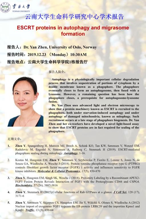 云南老员工命科学中心学术报告—Dr. Yan Zhen, University of Oslo“ESCRT proteins in autophagy and migrasome formation”