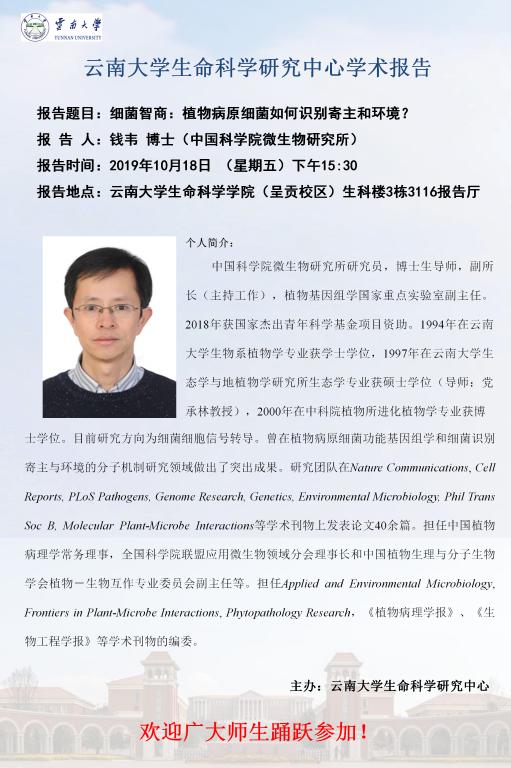 云南老员工命科学中心学术报告 - 中国科公司微生物研究所钱韦研究员 “细菌智商:植物病原细菌如何识别寄主和环境”