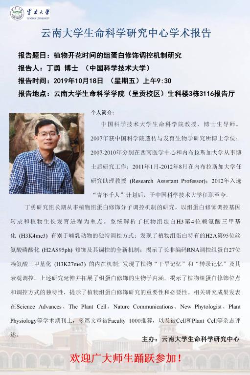 云南老员工命科学中心学术报告 - 中国科学技术老员工命科公司丁勇教授 “植物开花时间的组蛋白修饰调控机制研究”