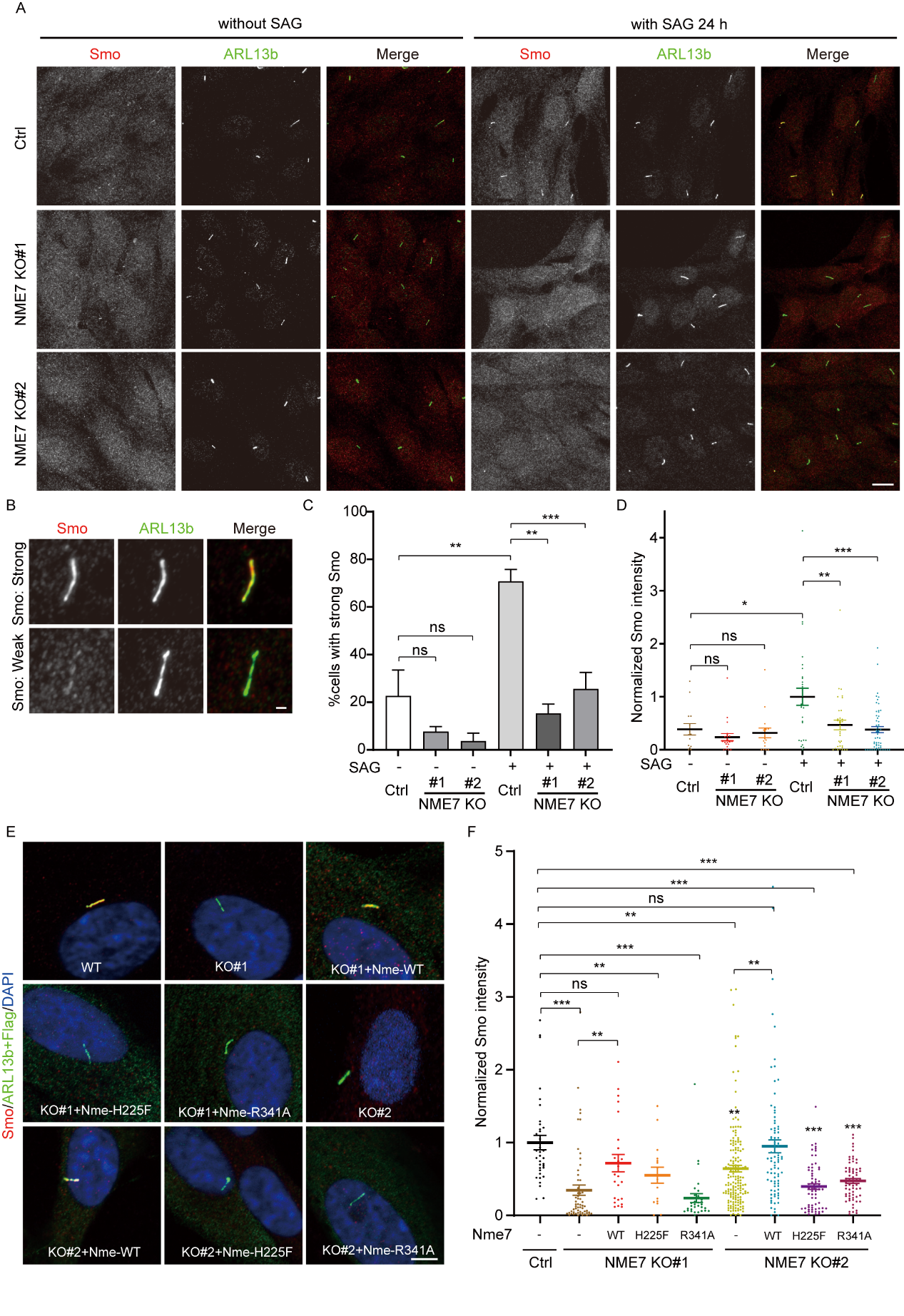 初级纤毛作为主要的Hedgehog信号传导细胞器,该研究发现NME7缺失会阻碍SMO的纤毛转位,即Hedgehog的激活。两个鼠Nme7突变体H225F和R341A分别破坏NME7的NDPK活性和γTURC完整性,结果显示NME7的NDPK活性和γTURC的形成能力可能对于纤毛Hedgehog信号传导很重要。