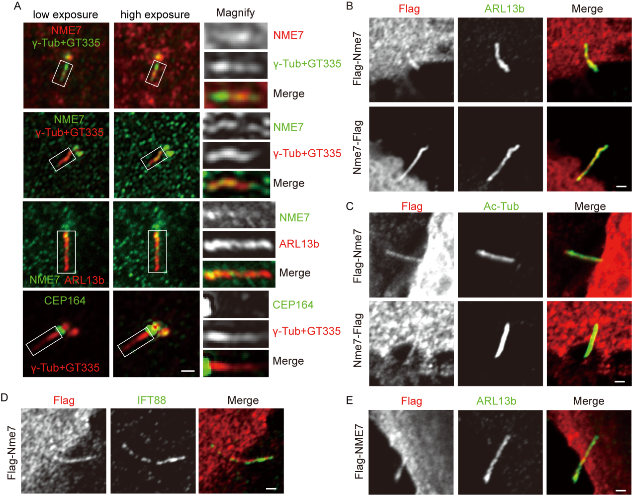 该研究注意到在有丝分裂期间的纺锤体以外的NME7微弱染色,因此实验探索了NME7是否也在纤毛中分布。使用高分辨荧光成像,检测内源性NME7染色信号倾向于在初级纤毛的近端部分。然后利用过表达的小鼠NME7和人NME7证实了一部分NME7存在于初级纤毛。
