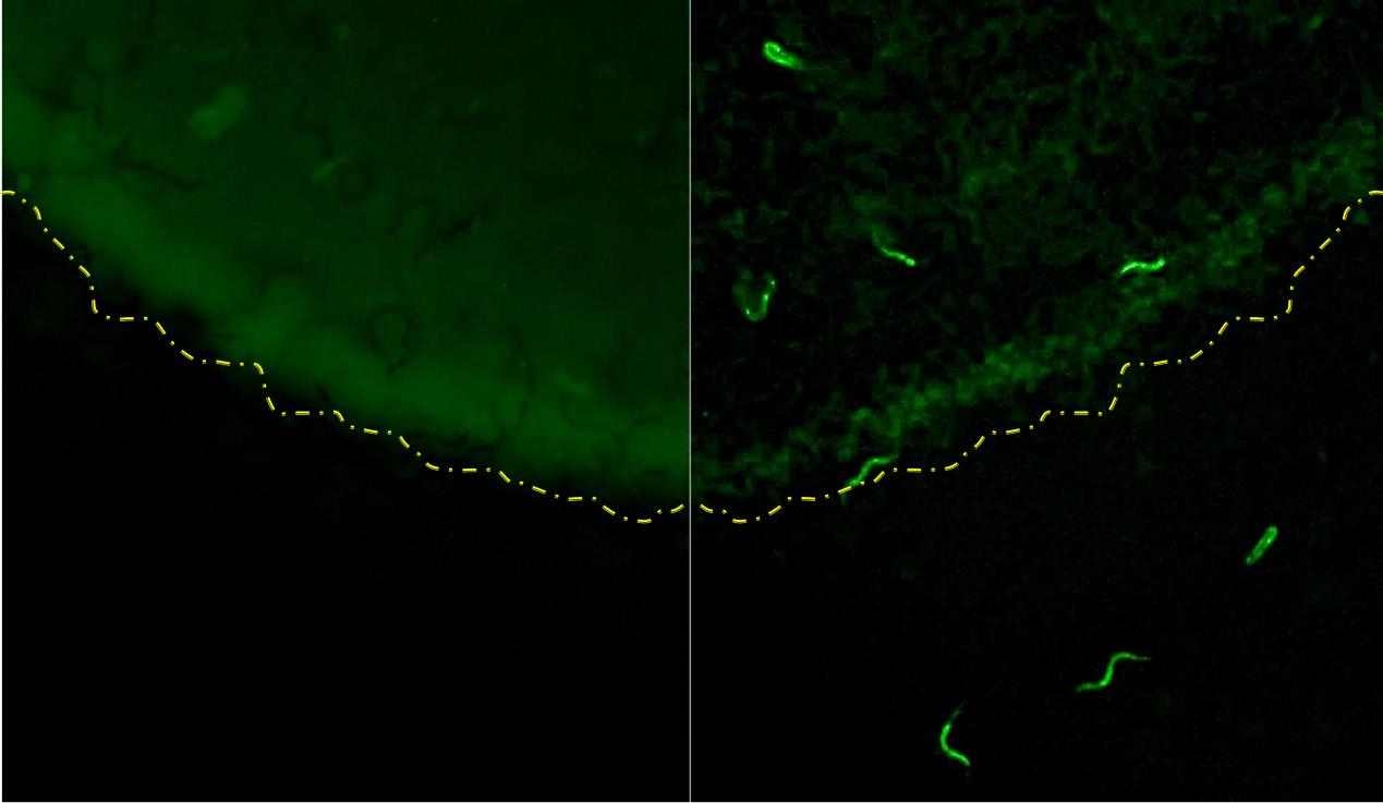 图1 . 低营养食物(右)激活动物UPRER (hsp-4p::GFP, 线虫发出绿色荧光),促使动物逃避食物。黄线表示食物的边界。