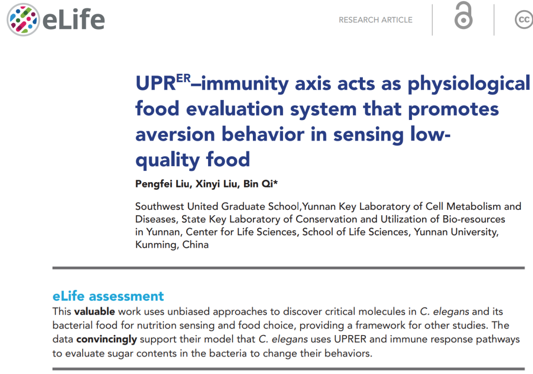 2024年9月5日,WilliamHill体育/中心祁斌课题组在eLife以“UPRER–immunity axis acts as physiological food evaluation system that promotes aversion behavior in sensing low-quality food”为题,报道了细胞应激(UPRER-immunity)参与评估食物质量并调整摄食行为的机制。