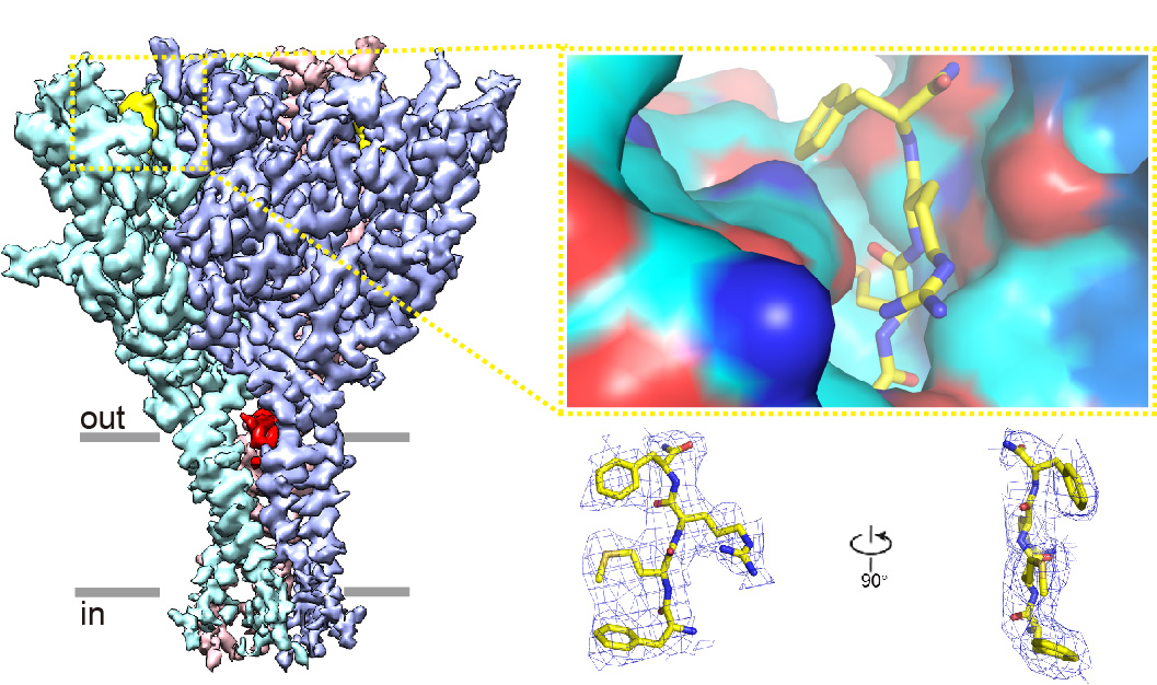 神经肽广泛分布于无脊椎动物和脊椎动物体内。研究表明,绝大多数神经肽都是作用于G蛋白偶联受体(GPCR),从而作为神经递质或神经调节剂调控许多生物学过程。Phe-Met-Arg-Phe-amide(FMRFamide)是最先在软体动物中发现的神经肽,具有增强软体动物心肌收缩力和调节心脏跳动等功能。与多数其他神经肽不同,FMRFamide可以直接结合并激活一类隶属于ENaC/DEG超家族的钠离子通道FaNaCs(FMRFamide activated sodium channel)。尽管已经有不少研究对FaNaCs的底物结合位点进行了探究,但精确的底物结合方式和门控机制仍不清楚,有待通过结构生物学等手段阐明。