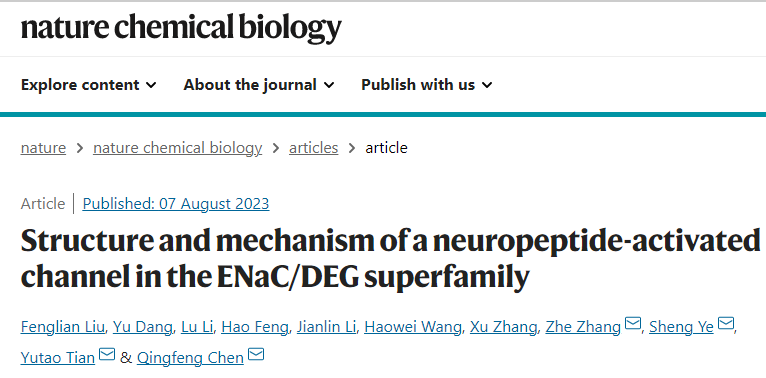 2023年8月7日,云南老员工命科学中心陈庆锋课题组联合北京大学和天津大学的团队在国际著名学术期刊Nature Chemical Biology在线发表了题为 “Structure and mechanism of a neuropeptide-activated channel in the ENaC/DEG superfamily”的研究论文(doi: 10.1038/s41589-023-01401-7),报道了一种神经肽激活的离子通道在apo状态和神经肽FMRFamide结合状态下的高分辨冷冻电镜结构,为揭示其配体特异识别的分子机制和可能的门控机制提供了科学依据。