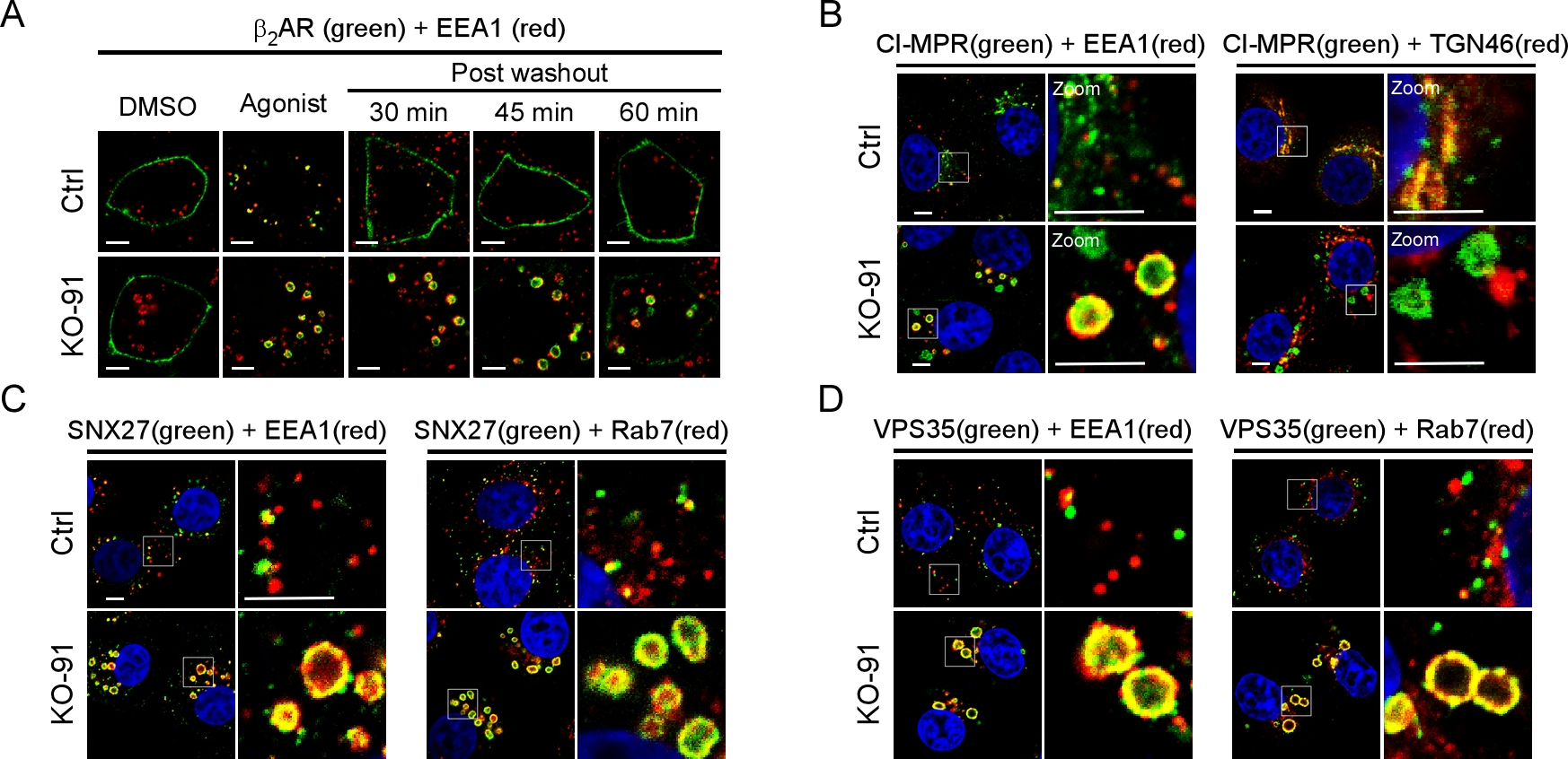 (A)WDR91缺失导致膜表面受体b2AR从内吞体到细胞膜的运输过程受阻。(B)WDR91缺失导致胞内受体CI-MPR从内吞体到高尔基体的运输过程受阻。(C)WDR91缺失导致Retromer组分SNX27在整个内吞体表面累积。(D)WDR91缺失导致Retromer组分VPS35在整个内吞体表面累积。