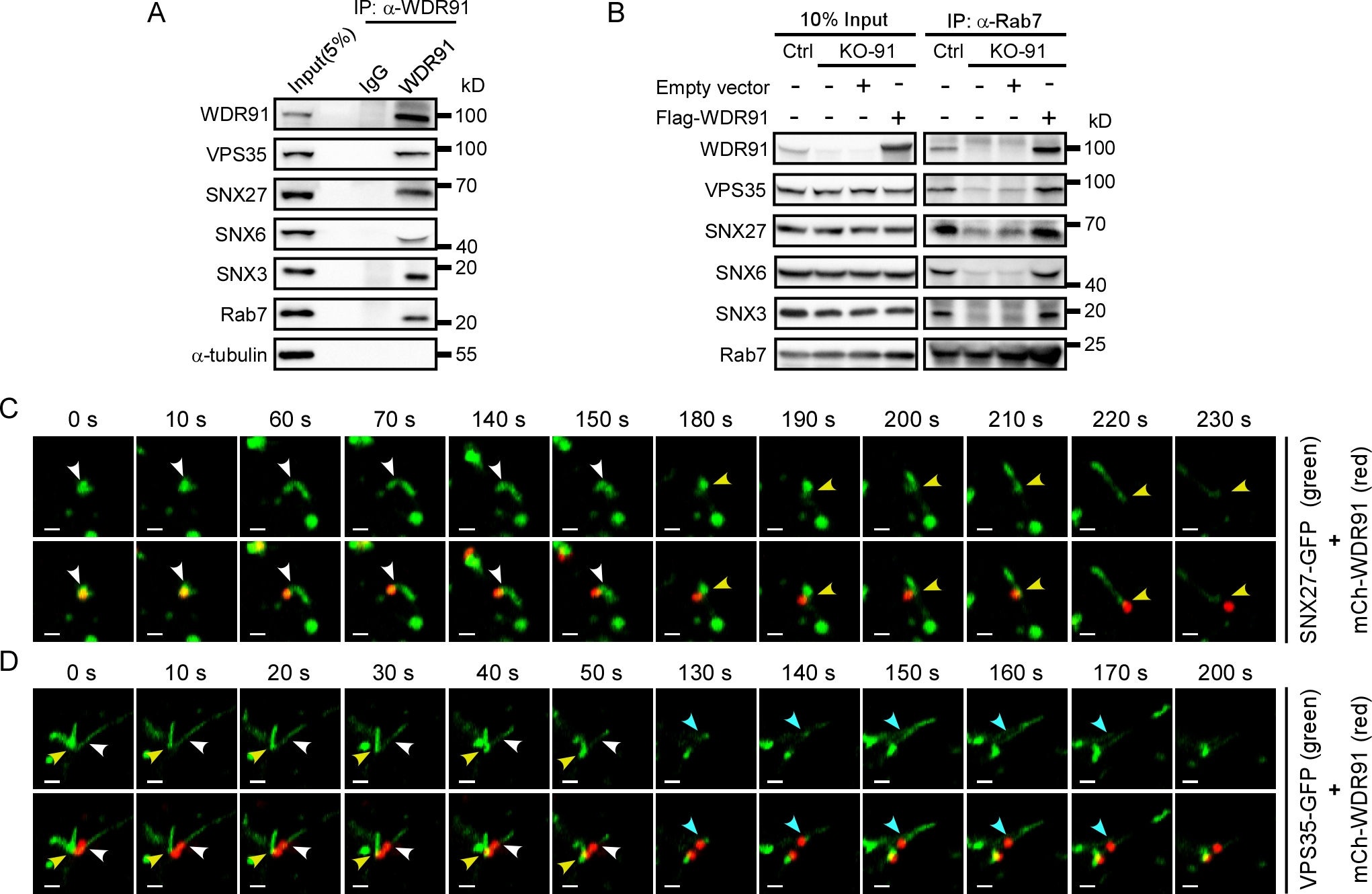 (A)WDR91Retromer各组分相互作用。(B)WDR91加强Rab7Retromer各组分的连接。(C)Retromer组分SNX27WDR91定位的局部区域形成管状结构。(D)Retromer组分VPS35WDR91定位的局部区域形成管状结构。