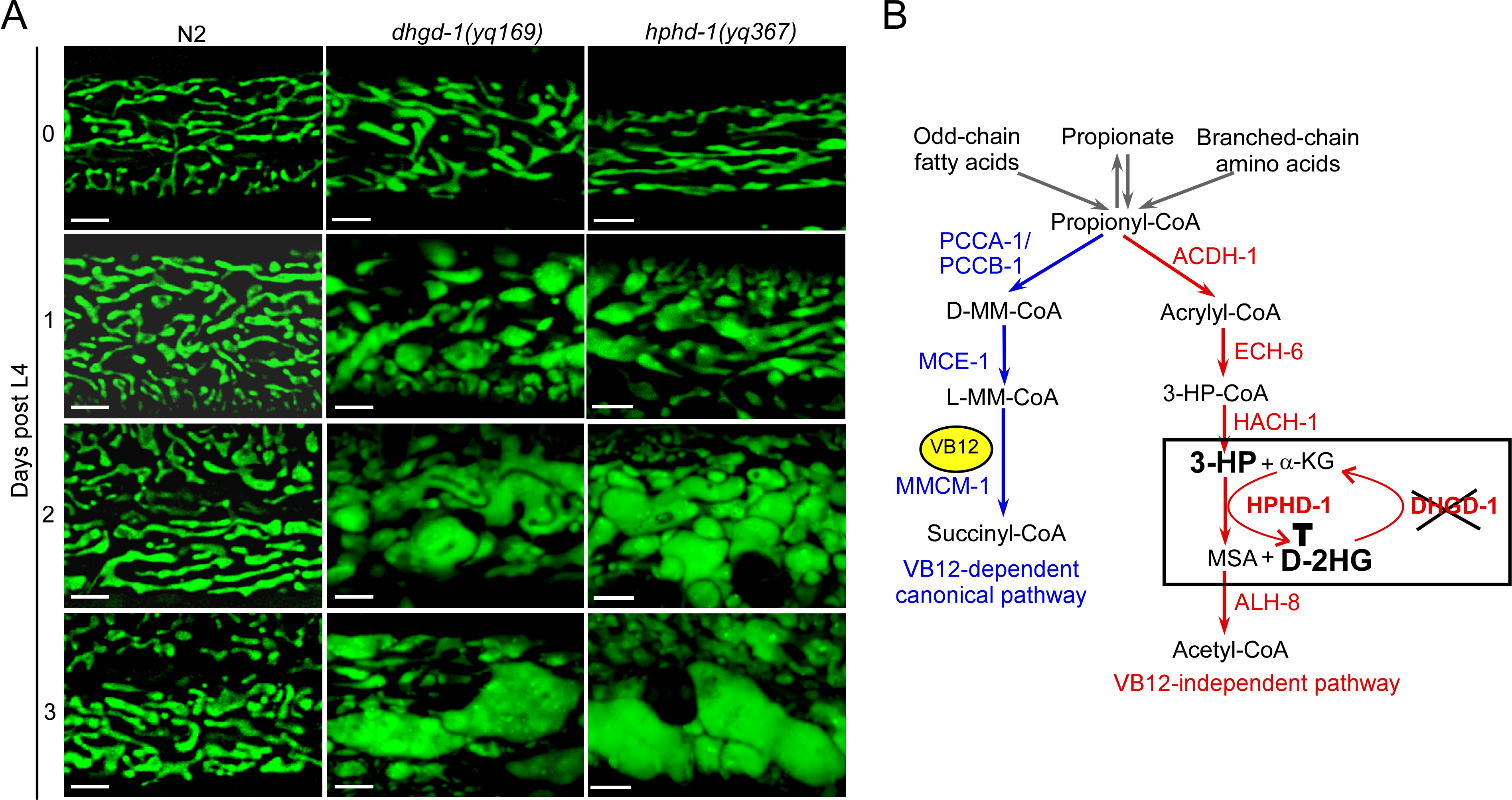 1. A 线虫中编码D-2HG脱氢酶的基因dhgd-1的突变和3-HP脱氢酶基因hphd-1的突变导致线粒体结构异常。B 线虫支链氨基酸、丙酸、奇数链脂肪酸的代谢通路:依赖VB12经典通路和不依赖于VB12 的通路。线虫在饲喂缺乏维生素 B12 的大肠杆菌 OP50(B-type E. coli)条件下,丙酸的分解代谢主要通过不依赖于VB12 的通路进行。在此代谢过程中,dhgd-1的功能缺失导致D-2HG过量累积,D-2HG结合并抑制3-羟基丙酸脱氢酶(HPHD-1)的活性,进而造成3-HP的累积。
