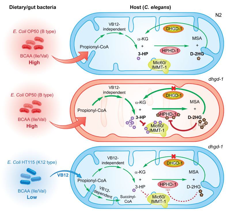 最后,研究者发现dhgd-1hphd-1突变体的线粒体缺陷受饮食/肠道细菌的影响。饲喂K12型大肠杆菌(HT115)可使这些突变体的缺陷性线粒体恢复正常。HT115大肠杆菌通过多种机制调节宿主3-HP的产生从而影响线粒体的结构与功能,包括激活依赖于VB12的丙酸代谢通路、减少宿主的丙酸来源(支链氨基酸)这些结果为D-2HG3-HP相关的人类疾病的治疗提供了重要思路(2)